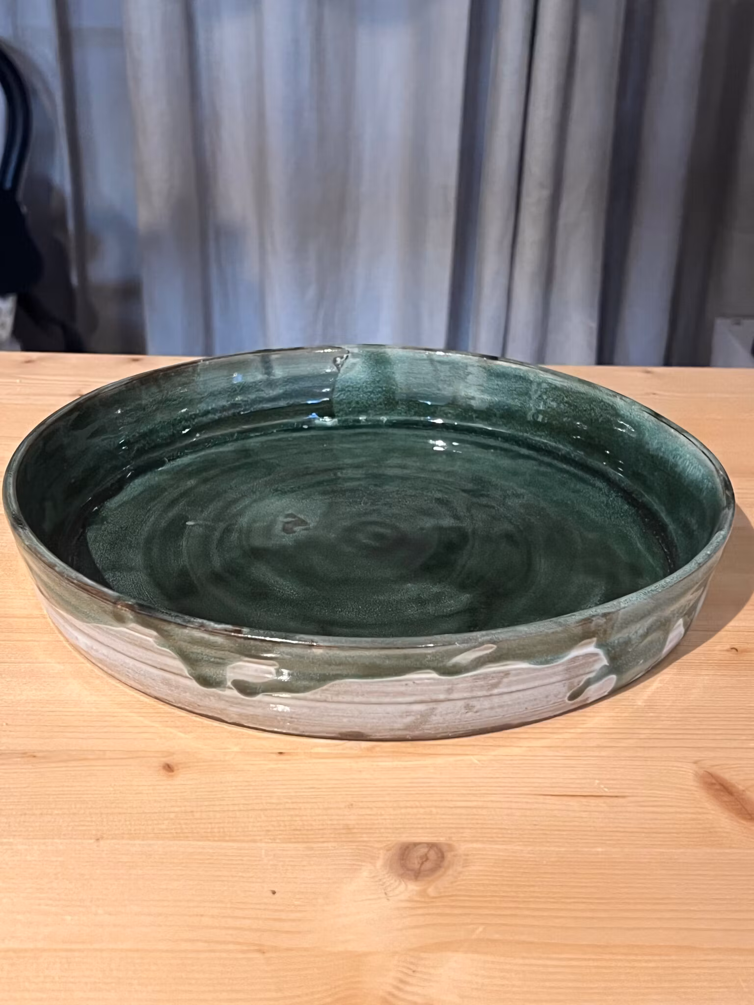 Diameter 27X höjd 5 cm. Drejar ugnsfast form eller serveringsfat. Fungerar bra i diskmaskinen och micro.
